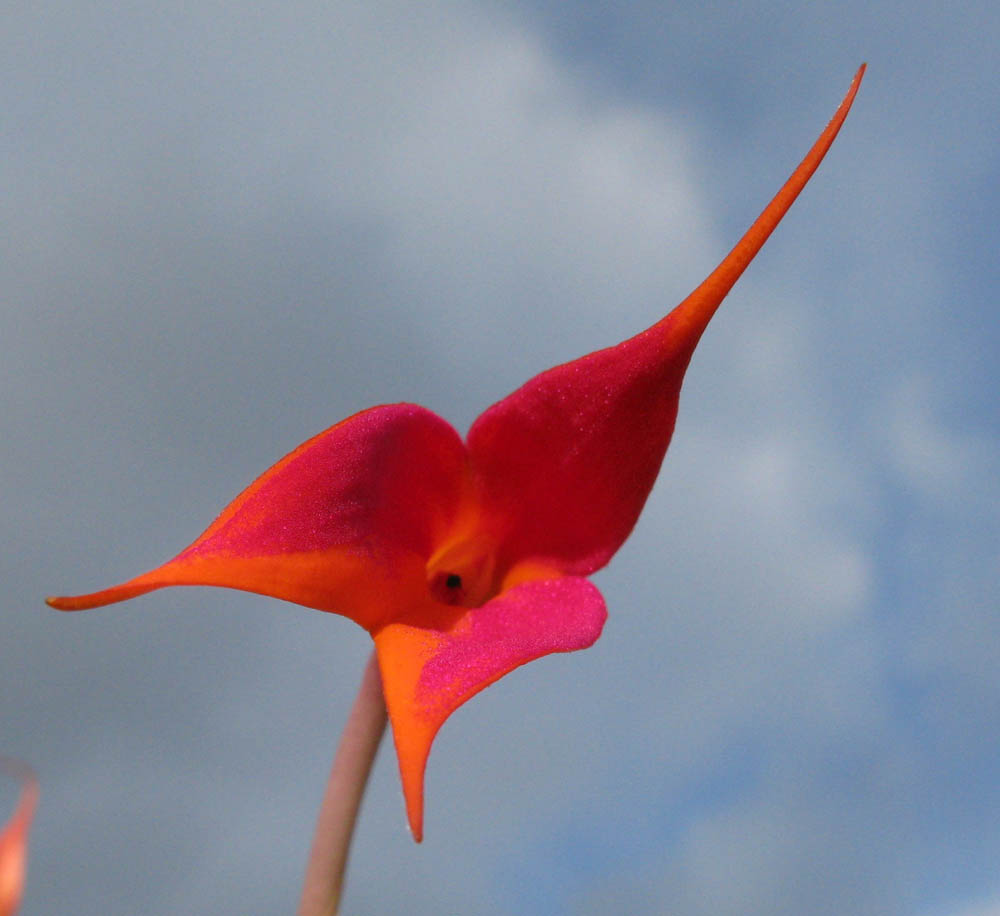 | Михаил Серебряный | Masdevallia (Orchidaceae). Рода в базе нет. Почти уверен (несмотря на то, что цветок уже не в лучшем состоянии), что M. veitchiana Rchb.f. Ежели в базе появится, можно было бы перенести. |