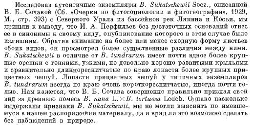 | Александр Эбель | Интересно, что в обработке берёз для сводки "Арктическая флора СССР" С.К. Черепанов вроде бы признавал B. sukaczewii за особый вид, отличая его от B. tundrarum (но при этом B. sukaczewii он упоминает лишь в примечании к B. tundrarum). Вот этот кусочек текста: Betula_sukatschewii.jpg |