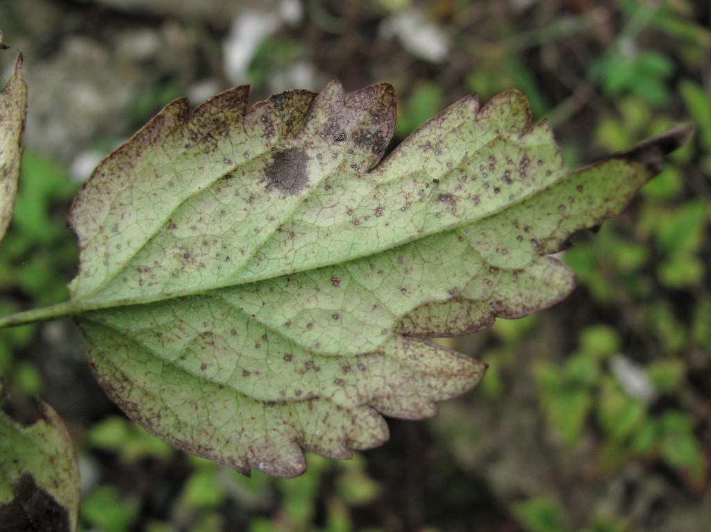 Листочек с поражениями (вид снизу). Краснодарский край, Сочи, окр. Хосты, рудеральное место. 22.10.2015.