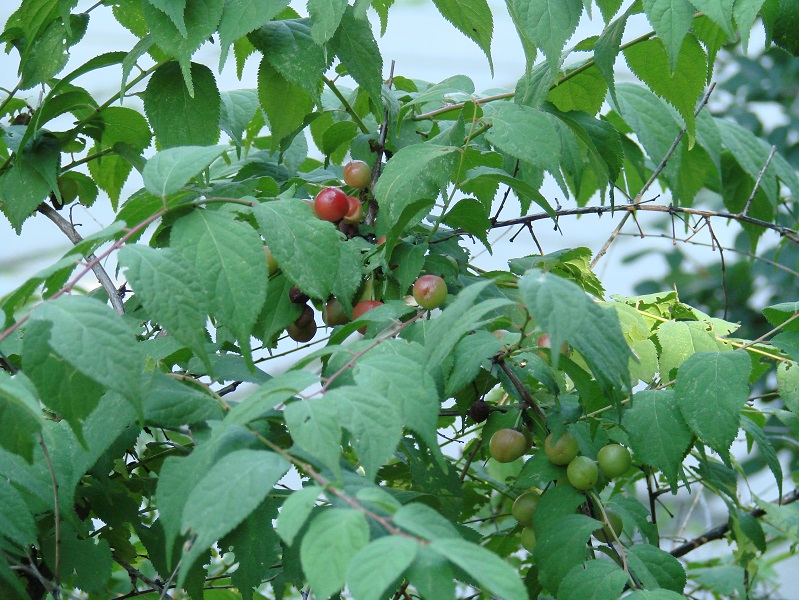 И желтые, и красные могут быть. Но с такими размерами и группами, конечно не слива. Тоже соглашусь, что вишня. У нас такая же встречается, но на определение пока не попадалась.Плодоножки длинные, попарно. Думаю все же вишня какая-то. И даже видела её, кажется, в виде плодов на рынке |
