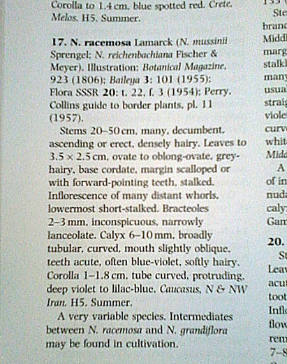 Котовник был куплен как Фассена, но оказался не им. Пришлось определять, сделав допущение, что это вид с территории бСССР. Я знаю, что так можно получить неверный результат, но моё растение вполне подошло под описание, да и существенных отличий на фото к . Мусина из природы я не увидела.Неправильно идти по ключам, к примеру Фл СССР если нет уверенности, что это вид с этой территории. Не знаю есть ли обработки Котовников мировой флоры, хоть по секциям. |