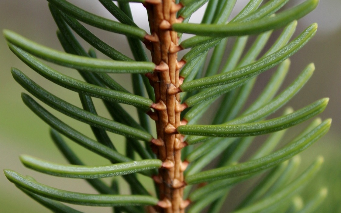 Фото обломанной веточки, в верхней части которой хорошо видны "держатели" иголок. Также видно, что иголки заканчиваются мягко. Такой ели можно пожать "лапу", не боясь уколоться.