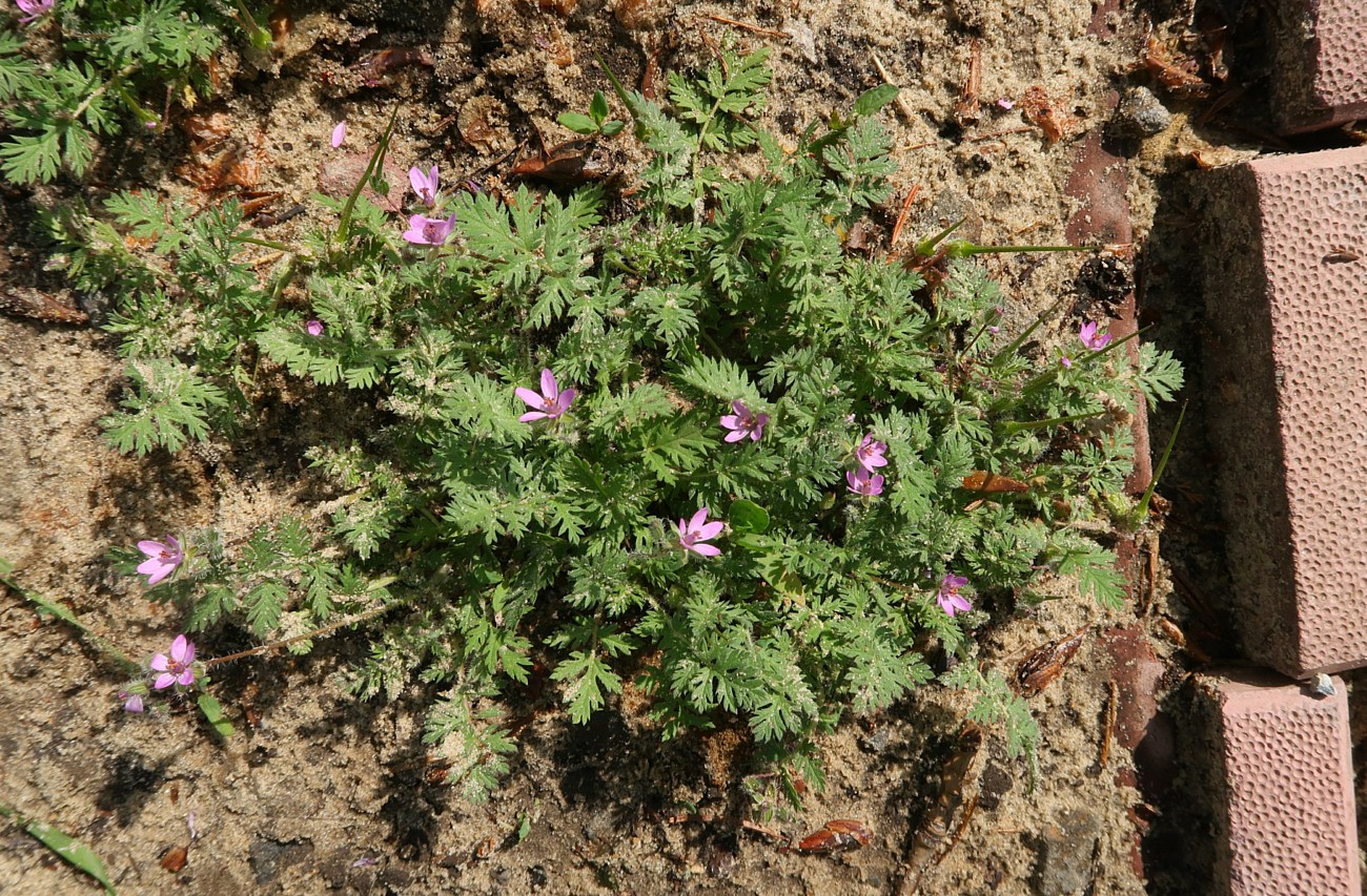 Миниатюрные цветущие и плодоносящие растения. Украина, г. Луганск, ул. Советская, окрестн. библ. им. Горького, тротуар, в щели между плитками. 25.05.2023.