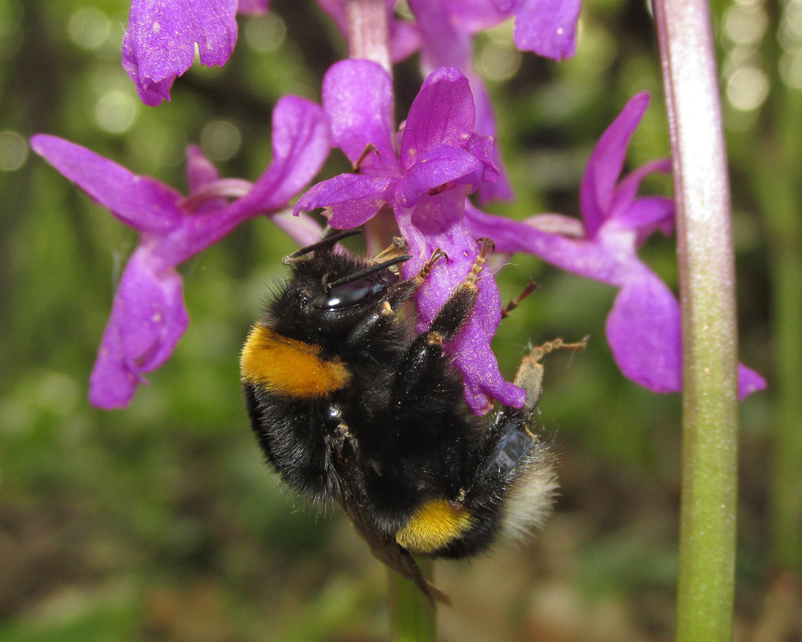 Соцветие со спящим шмелем Bombus terrestris. Крым, Бахчисарайский р-н, пер. Бечко, буковый лес. 2 мая 2016 г.