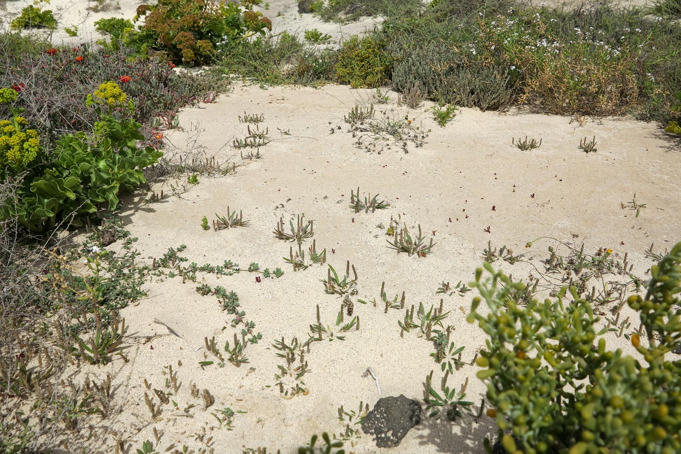 Цветущие и плодоносящие растения (Plantago aschersonii Bolle) на пляже los Lagos de Cotillo. Испания, автономное сообщество Канарские острова, остров Фуэртевентура, провинция Лас Пальмас, муниципалитет Ла Олива, пос. Эль Котильо. 10.03.2016.