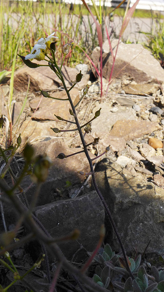 | Ирина Щеглова | Растение скорее всего заносное. По гербарию - листья в прикорневой розетке и на стебле. Листья продолговатые, можно даже сказать, что линейно-продолговатые, прикорневые до 10 мм, стеблевые в кол-ве 1-2, мельче прикорневых, сидячие. Листья в основном цельнокрайние, изредка встречаются с неясными зубцами, причем зубцы могут быть только с одной стороны. Сами стебли 7-9 см неветвистые, точнее ветвящиеся только от основания - от розетки может отходить два стебля. Общее строение такое - от старой, уже отмершей и погребенной в земле розетки отходит один-два стебля, на них образуются новые розетки, от которых опять отходят 1-2 стебля и ситуация повторяется. Растение шершавое, есть волоски довольно длинные и опушение плотное, листья седоватые, особенно снизу, а вот какие волоски и есть ли железки без бинокуляра не разглядеть. Лепестки 6 мм, чашелистники 3мм. Плодов нет, увы. Могу приложить фото с гербария |