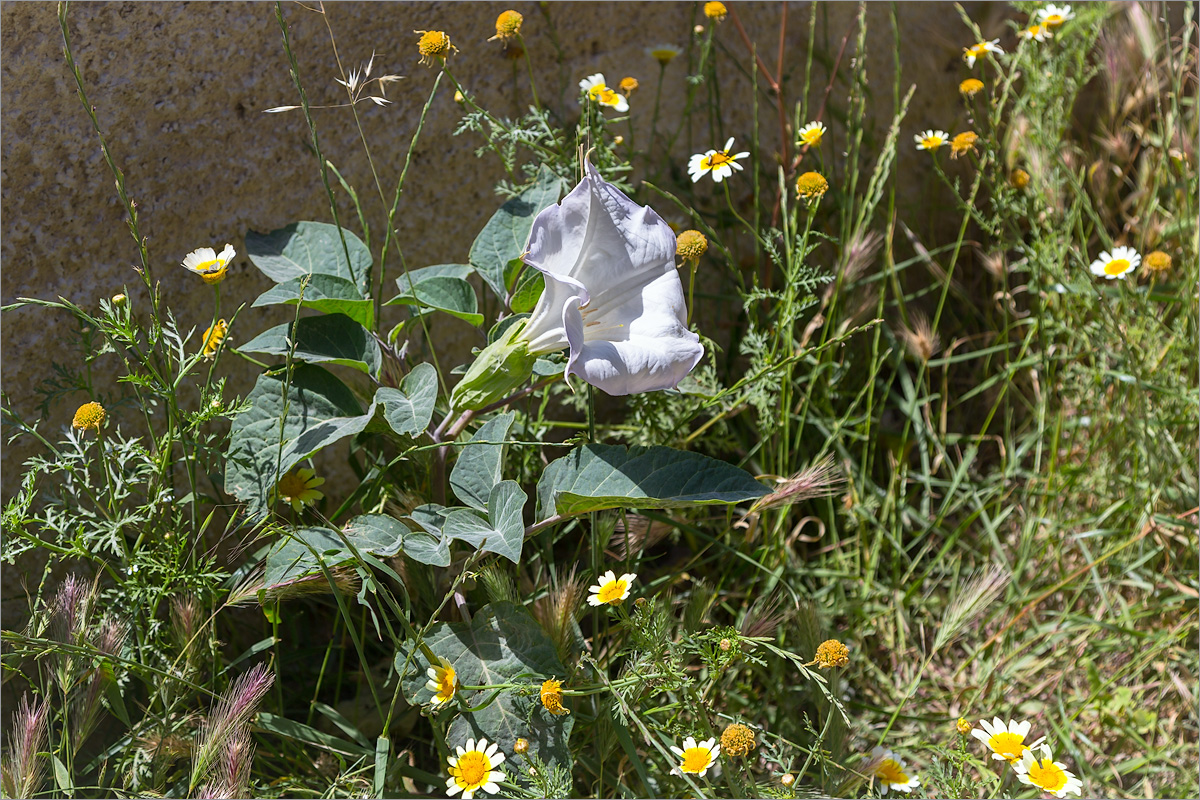Цветущее растение в сообществе с Glebionis coronaria и Hordeum murinum. Греция, о. Санторини, узкая полоса газона между тропой и парапетом на обрывистом склоне. 03.05.2014.