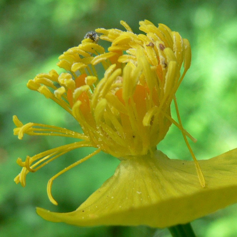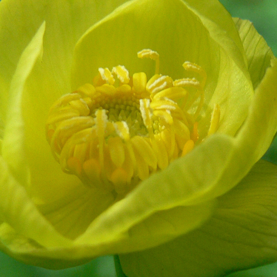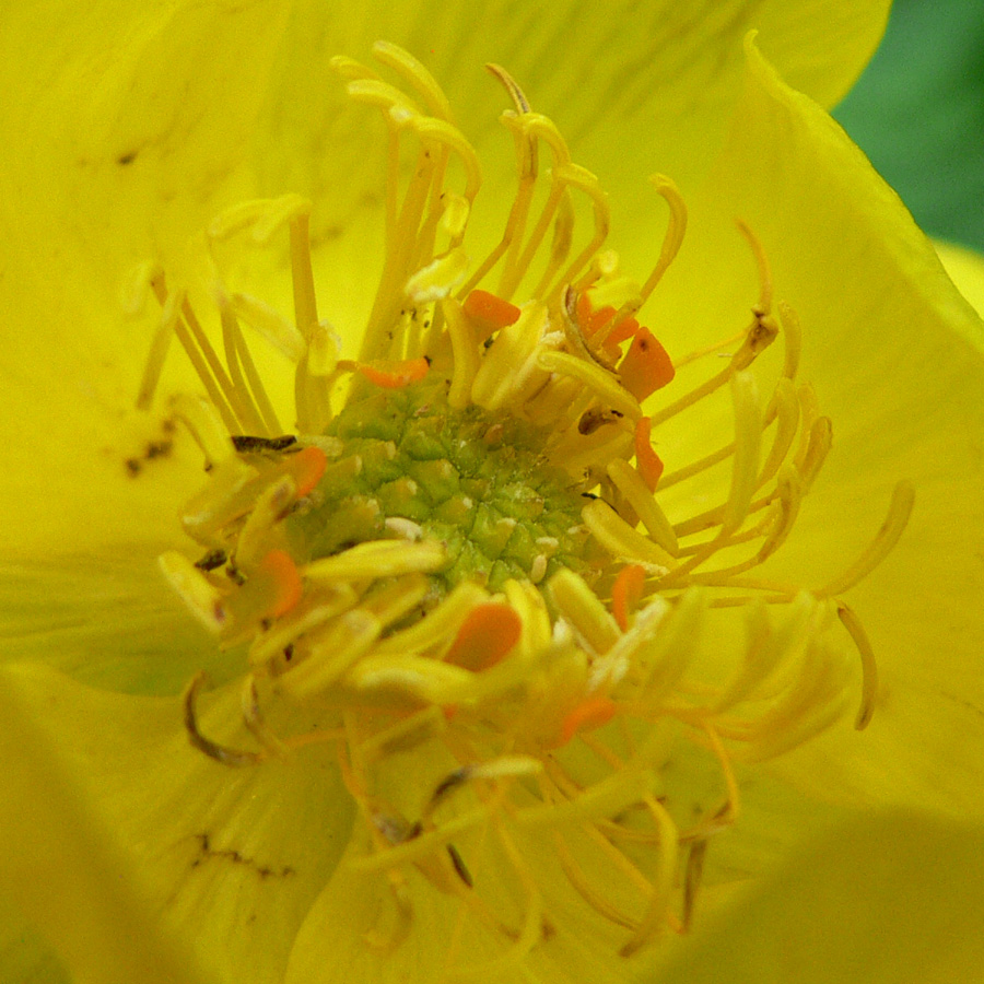 | Сергей Глотов | Купальницы ещё цветут. Сфотографировал внутренности. А что там должно быть? По внешнему кругу много-много длинных типа тычинок. Внутри углубление. Всё жёлтое. |
