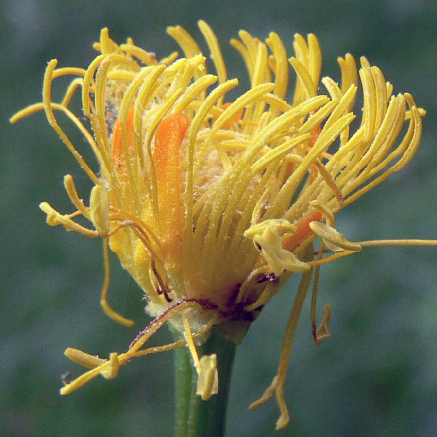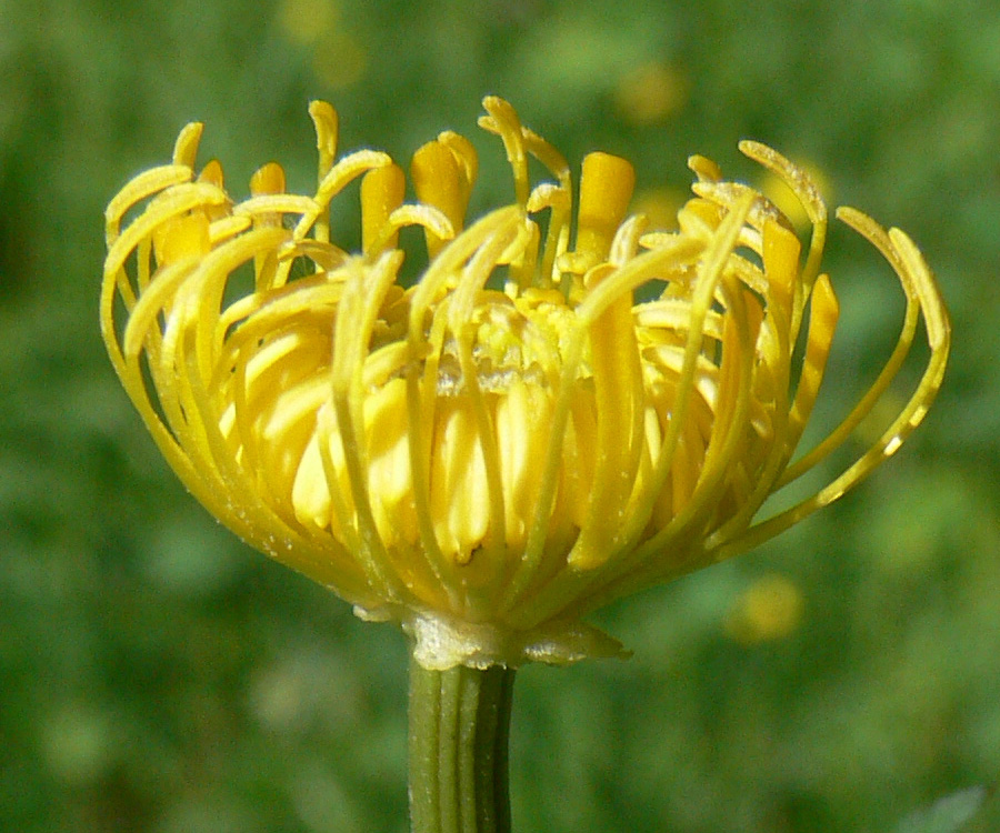 По внешнему кругу много-много длинных типа тычинок. Внутри углубление. Всё жёлтое.