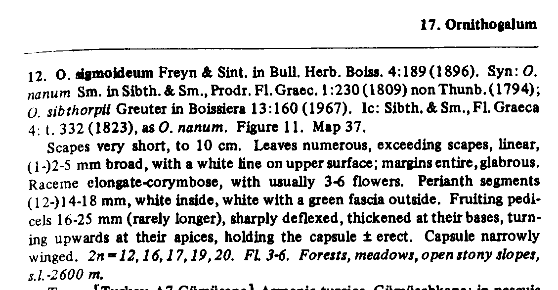 Флора Турции O. sibthorpii сводит в синонимы O. sigmoideum. O. sigmoideum и O. wiedemannii различаются по форме цветоножек при плодах, у первого - они сигмовидно изогнуты (как видно на фото в Плантариуме), у второго - нет. Кроме того слабо выраженная белая полоса на верхней стороне листьев, которой практически не заметно на этой фотографии, свидетельствует скорее о O. wiedemannii. |