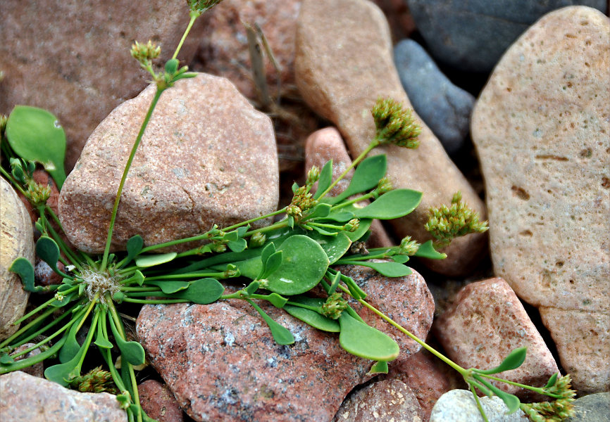 Плодоносящее растение (слева цветет Indigofera nephrocarpa). Сокотра, южное побережье в окр. дер. Аомак, каменистый склон у подножия горы. 31.12.2013.