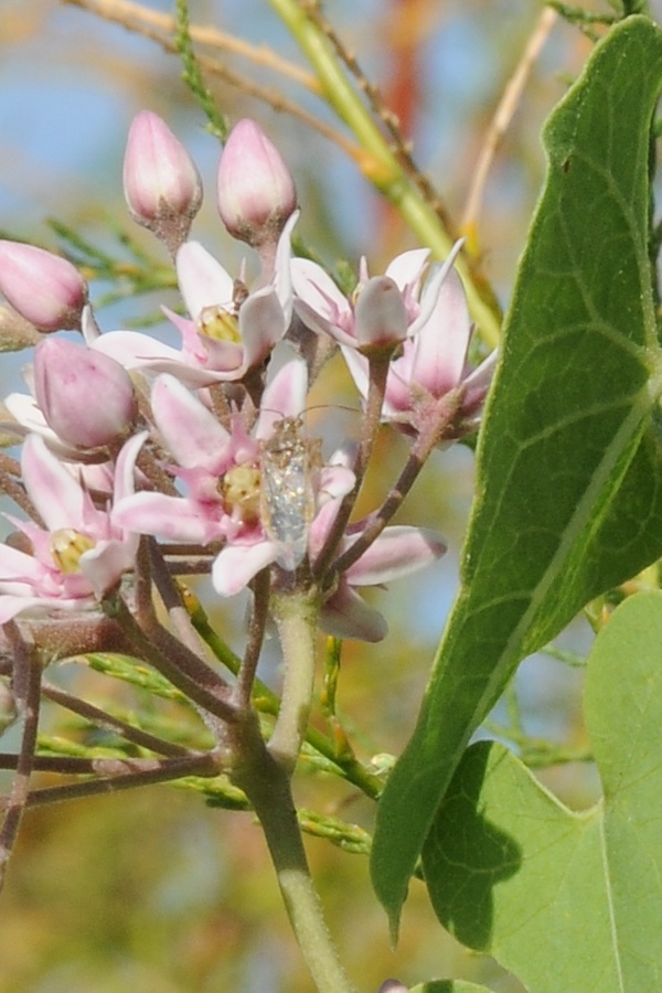 Часть побега с соцветием и кормящимся(?) клопом (сем. Rhopalidae) на тамариксе. Казахстан, Алматинская обл. возле вдхр. Капчагай, полоса кустарников вдоль берега. 13.07.2016.