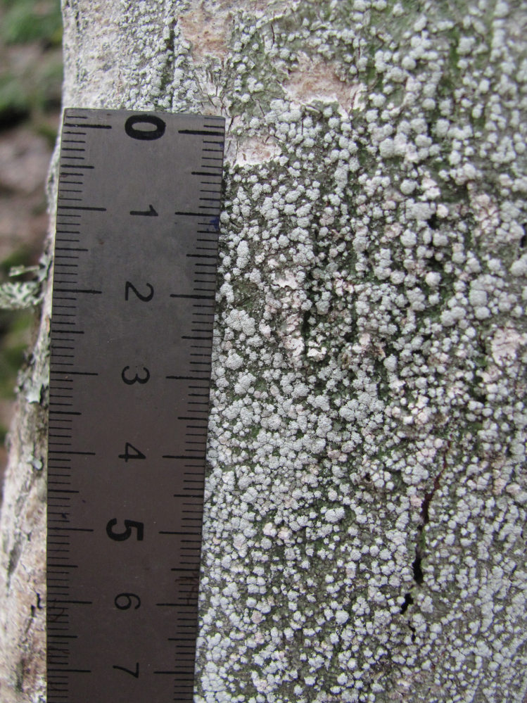 Часть таллома с плодовыми бородавочками, несущими соредии (?). Краснодарский край, Абинский р-н, окр. пос. Новый, лес близ Новых скал, на стволе Carpinus betulus. 06.01.2017.