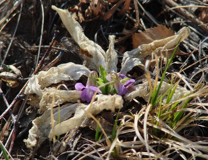 Расцветающее растение в розетке сухих прошлогодних листьев. Иркутская обл., Иркутский р-н, окр. дер. Жердовка, опушка сосново-берёзового леса. 14.05.2016.