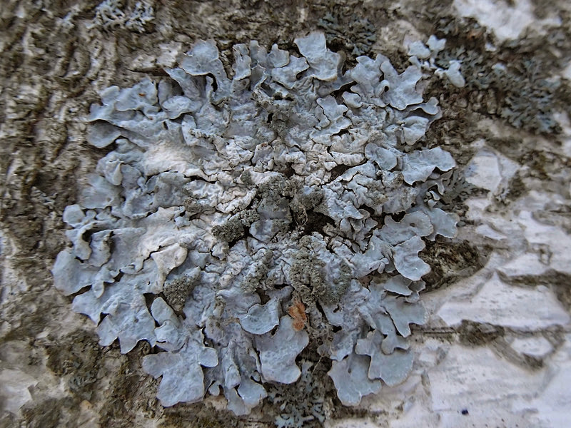 Молодые слоевища, развивающиеся из старого таллома. Марий Эл, г. Йошкар-Ола, Центральный парк, на стволе молодой берёзы. 11.01.2017.