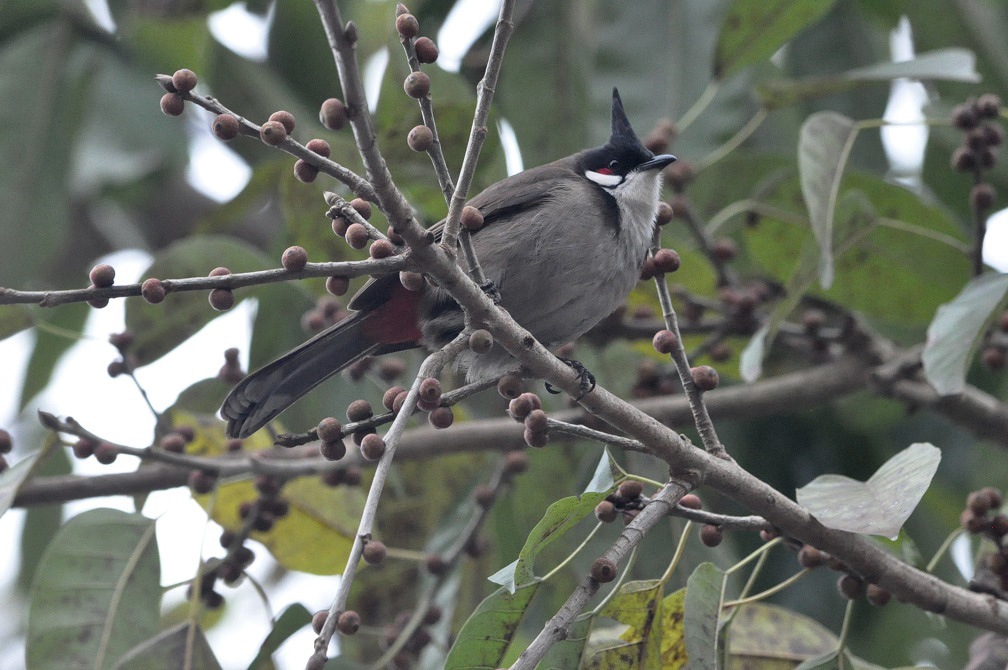 Ветвь с сикониями и сидящим краснощеким бюльбюлем. Китай, национальный парк Shaoguan Danxia Mountain Geopark, берег реки Jin River (на некоторых картах она обозначена как Jinjiang River), 25 февраля 2016 г.