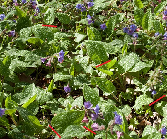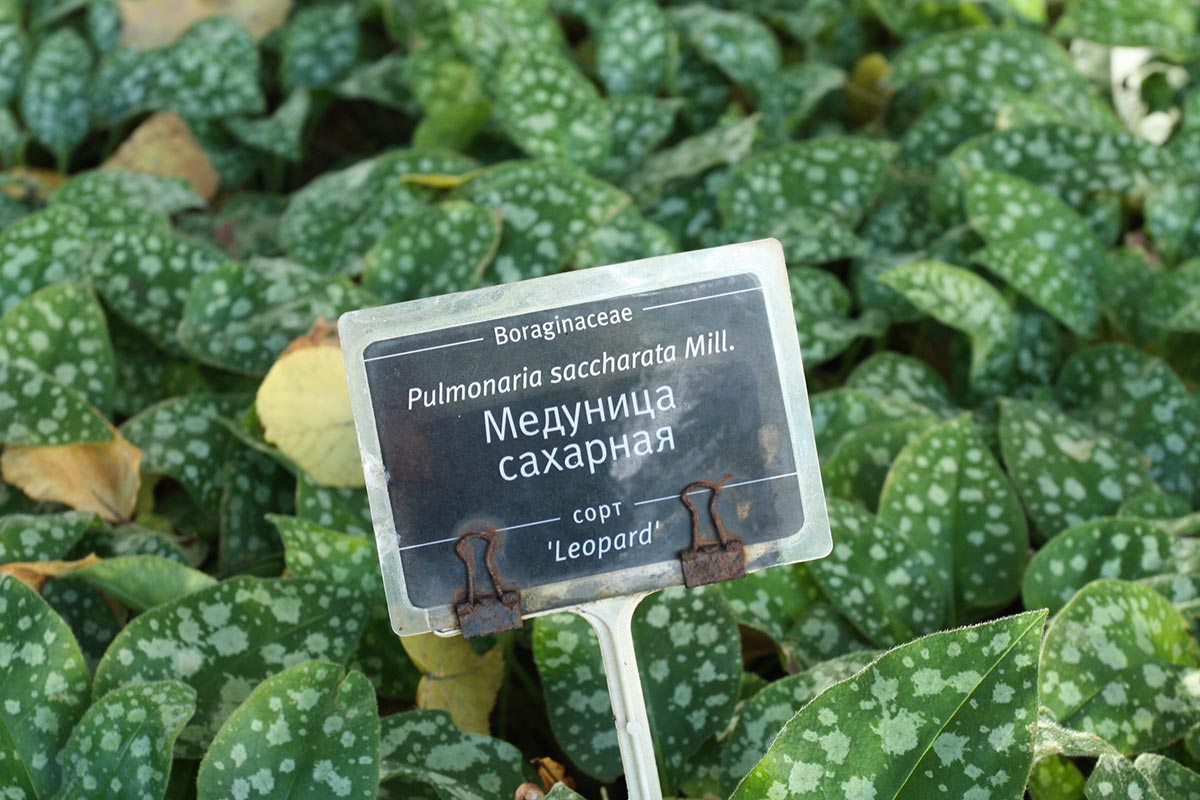 На других фото, отнесённых у нас к Pulmonaria saccharata, цветки как розовые, так и синеватые.Кстати: 'Leopard' is a vigorous, semi-evergreen perennial to 30cm tall, with broad leaves heavily spotted with silvery green, and pink flowers in late winter and spring |