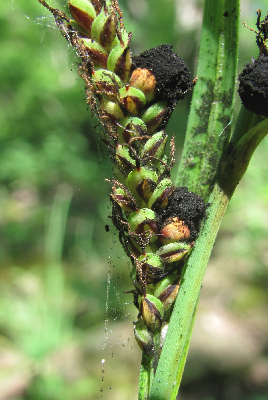 Часть побега с женским колоском, поражённым головнёвым грибом Anthracoidea sp. Краснодарский край, Абинский р-н, окр. пос. Новый, преим. дубовый лес. 13.06.2017.