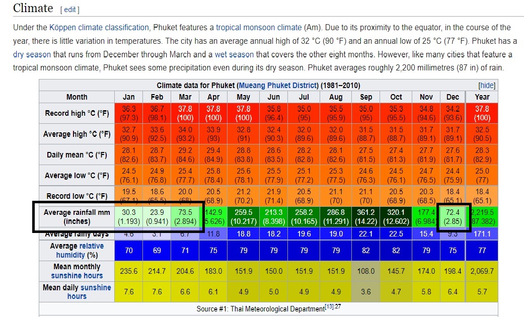 Я была там в так называемый сухой период. 5 дней из 14 лили тропические дожди. Не думаю, что за 5 дней лес мог высохнуть. И это не исключение. Всюду пишут, что сухой сезон не означает полное отсутствие дождей. Там не только деревья, но и трава не высыхает, даже не подсыхает. Phuket_climate.jpg |