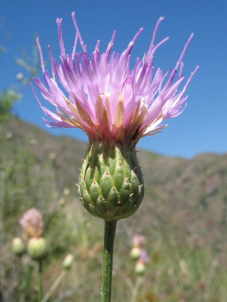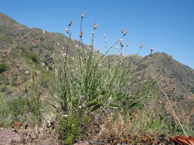 Соцветие с кормящейся бабочкой Melanargia parse. Казахстан, Западный Тянь-Шань, Киргизский хр., ущ. Мерке, выс. около 1500 м н.у.м., каменистый гребень на склоне зап. экспозиции. 6 июля 2017 г.