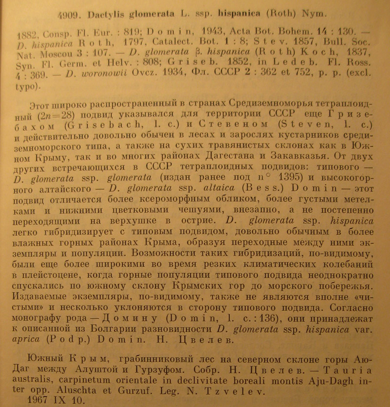 Цвелёв в "Списке растений гербария флоры СССР" (см. пристёгнутый файлик) указывает, что в Крыму hispanica и glomerata гибридизируют (будучи подвидами), и что растения часто характеризуются промежуточными признаками. Видимо, это наш вариант... hispanica.jpg |