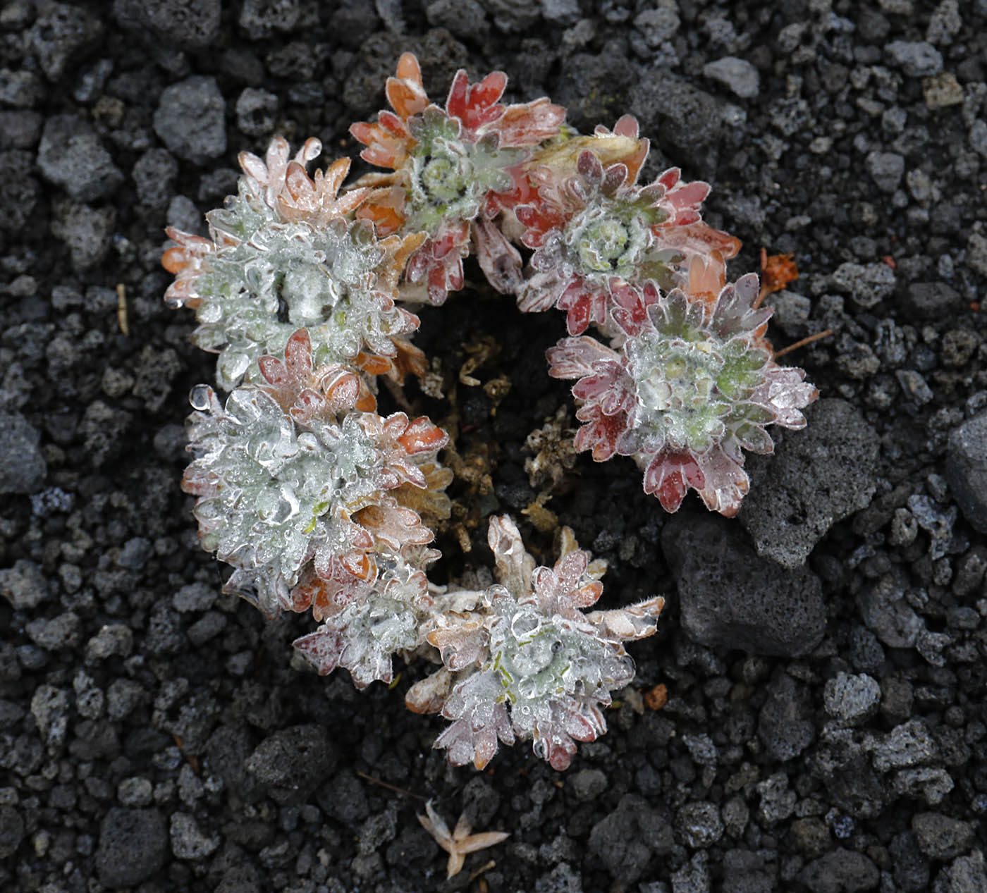 Растение в каплях росы на вулканическом пепле. Камчатка, южные склоны влк. Толбачик, р-н извержения 2012-2013 гг. 13 сентября 2017 г.