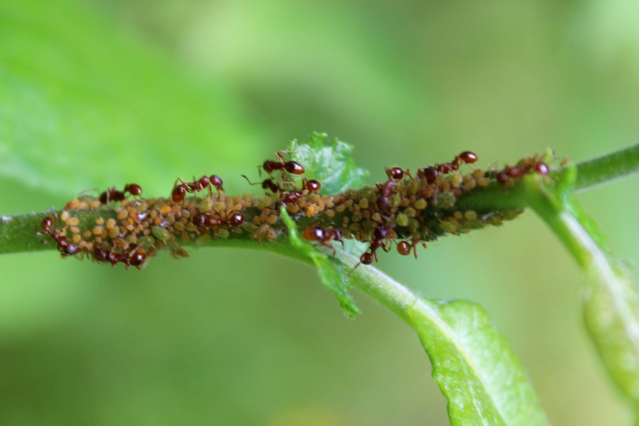 Верхушка растения, поражённого тлёй, которую "пасут" муравьи. Беларусь, г. Минск, мкр-н Сосны, зарастающая просека в сосновом лесу. 22.07.2017.