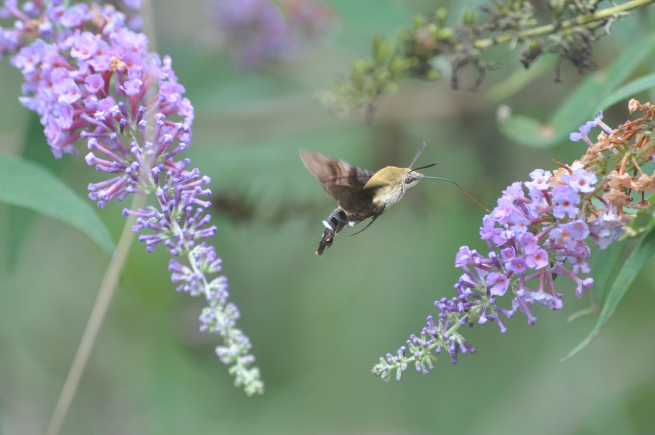 Соцветия и кормящийся бражник. Южный Китай, провинция Хунань, парк Zhangjiajie National Forest Park, долина небольшого ручья. 6 октября 2017 г.