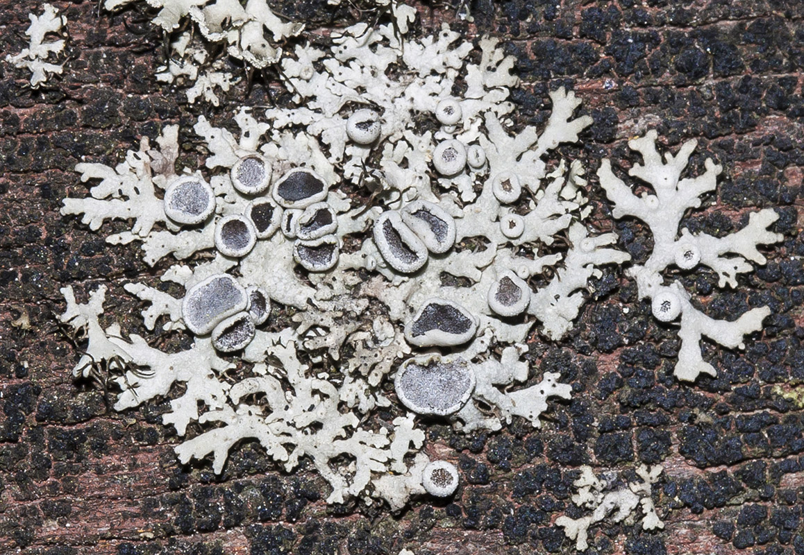 Слоевище с апотециями. Московская обл., Мытищинский р-н, окр. пос. Пироговский, пос. Победа, на крашеной дощатой скамье. 03.05.2018.