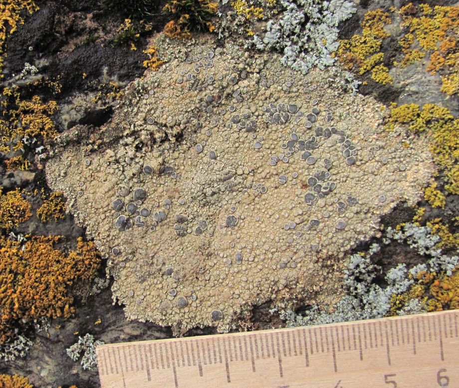 Таллом с апотециями. Кабардино-Балкария, Эльбрусский р-н, окр. пос. Эльбрус, ок. 1800 м н.у.м., скала. 09.08.2018.