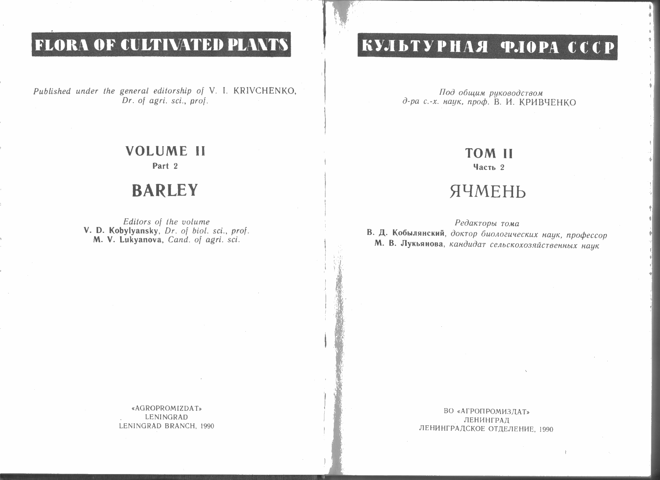 Авторы этой Флоры пишут: "Наши исследования подтверждают выводы многих авторов о генетическом единстве между формами и расами культурного ячменя. Мы рассматриваем, также как и Н.И. Вавилов, все культурные ячмени как один вид - H. vulgare L., в котором выделены два подвида: subsp. vulgare - ячмень многорядный и subsp. distichum (L.) A. Trof. - ячмень двурядный (= H. distichon L.). В пределах каждого подвида мы выделяем по две группы разновидностей (convar.) по признакам срастания зерновок с цветковыми пленками (пленчатые и голозерные)."