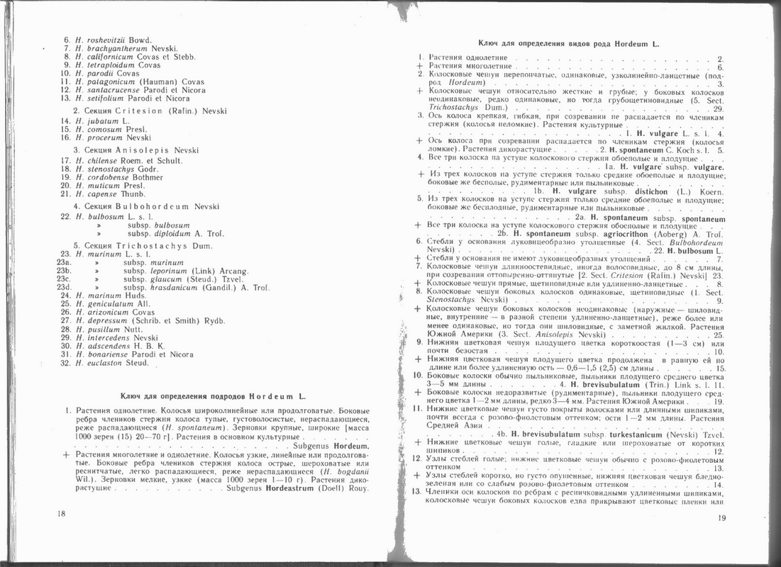 Как правильно подметил Андрей Любченко, агрономические и ботанические классификации часто не совпадают, хотя агрономы - те же самые ботаники, только узкой специализации. Особенно селекционеры, которые работая, можно сказать, ежедневно с определёнными видами, подвидами, вариациями создавая свои новые сорта, на протяжении многих лет. Как не им видна та, или иная степень устойчивости какого либо признака. Поэтому, когда приходиться делать выбор систем классификации, то я предпочитаю ту, что применяется в агрономической науке, в случае, конечно же, если речь идёт о культурных растениях. Взять, хотя бы те же самые культурные ячмени. Агрономическая систематика проста, легка и логична. В "Культурной флоре СССР" - смотрится несколько не совершенной, ключ построен неудачно, порою ставящий в тупик перед выбором. Вот к примеру, теза и антитеза описывающие плотность колоса: плотный и очень плотный. Каким прибором это можно измерить? А вот ячмень на фото № 59668 - ячмень четырёхрядный и вовсе не поддаётся определению по "Культурной флоре СССР" , поскольку она делит вид ячменя культурного только на шестирядные и двурядные подвиды. А вот в агрономической классификации для него выделен подвид Hordeum intermedium VaV. По агрономической классификации 1997 года ( может есть более поздние другие, я не знаю) Род Hordeum включает один вид культурного ячменя - Hordeum sativum Jessen ( так написано в книге, правильнее, наверное, применить стандартно употребляемое правописание автора - Jess.). Этот вид делится на три подвида: 1. Hordeum vulgare L. - ячмень многорядный, или обыкновенный. На каждом членике колосового стержня имеется по три плодущих колоска. Этот подвид, в свою очередь, делят на две группы. Первая - группа правильных шестирядный ячменей hexastichum L. у которых колос в сечении имеет вид правильного шестигранника. Вторая - группа неправильных шестирядных ячменей tetrastichum L. в сечении колоса имеют вид прямоугольника (т.е. четырёхгранные). По агрономической классификации именно к этой группе и принадлежит обсуждаемое изображение.