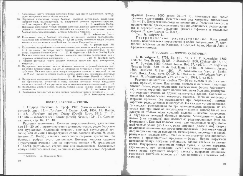 к примеру, вот тут, утверждают, что в культуре только один вид ячменя - Hordeum sativum Lessen - http://agronomiy.ru/botanicheskoe_opisanie_yarovogo_yachmenya.html