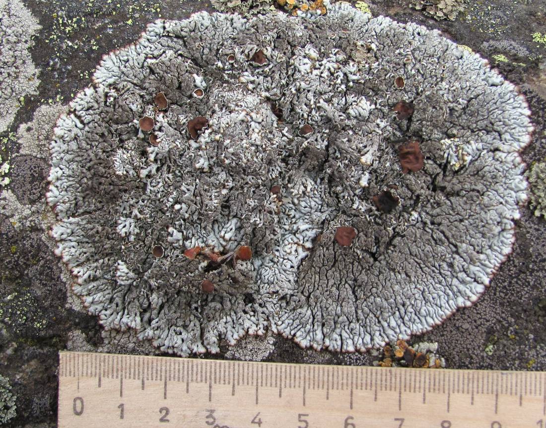 Таллом с апотециями. Кабардино-Балкария, Эльбрусский р-н, долина р. Ирик, ок. 2300 м н.у.м., скальный выход. 05.08.2018.