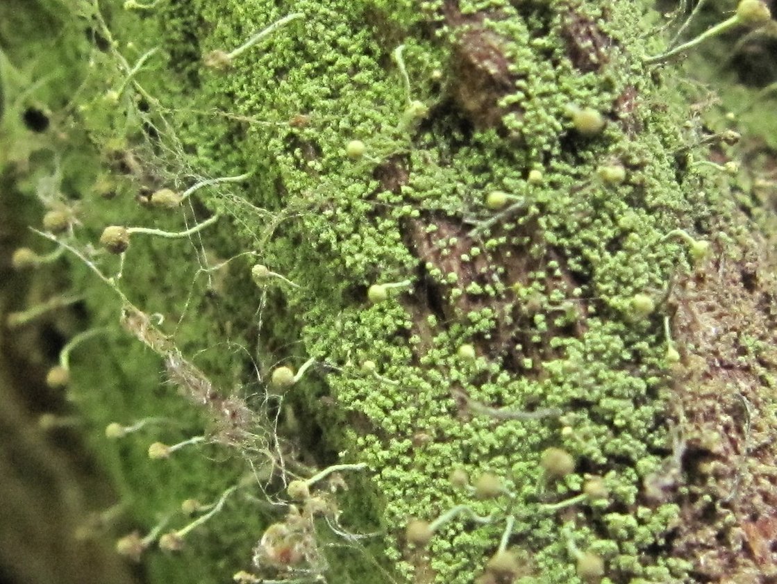 Таллом с апотециями (апотеции на ножках). Кабардино-Балкария, Эльбрусский р-н, окр. с. Бедык, ок. 1000 м н.у.м., затенённое влажное место в лесу, на валеже. 08.08.2018.