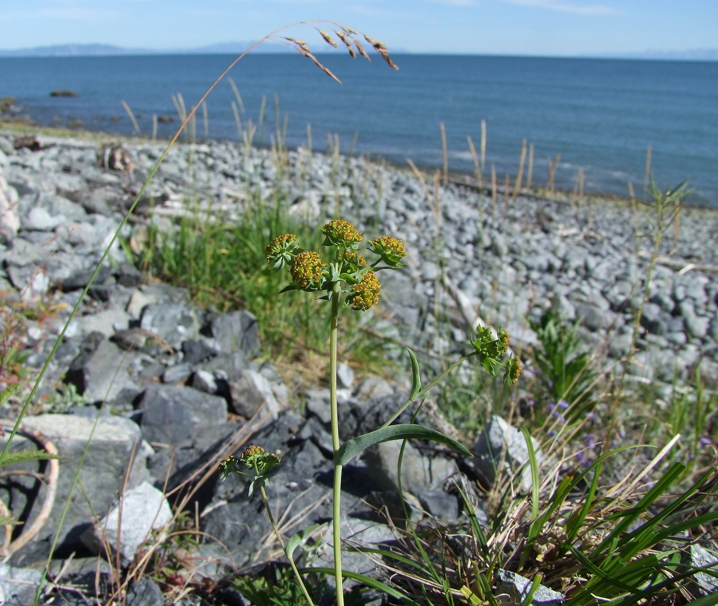 Верхушка цветущего растения среди россыпи камней. Магаданская обл., окр. г. Магадан, побережье бухты Гертнера. 28.07.2018.