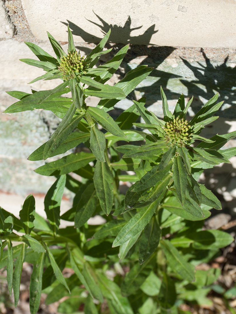 Верхушка побега с соцветием в бутонах. Ленинградская обл., Кингисеппский р-н, окр. дер. Урмизно, мыс Дубовский, близ брошенного поста технического наблюдения 6-й погранзаставы, луговина у дороги среди смешанного леса, на замшелом камне. 18.05.2019.