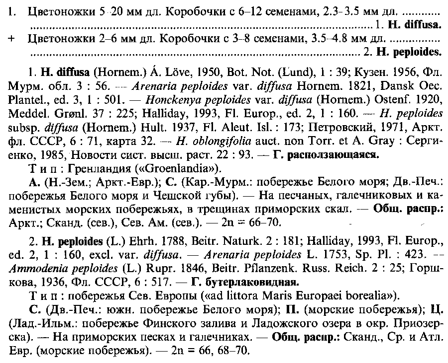 | Дмитрий Орешкин | Наверное, Honckenya oblongifolia, но сказать точно затрудняюсь. См. кусочек ключа Flora Vostochnoi Evropy, v. 11, p. 182.png |