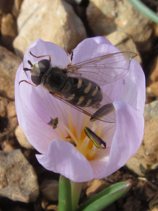 Цветущее растение с сидящей мухой Eupeodes corollae. Крым, Севастополь, Балаклава, гора Крепостная. 04.02.2020.