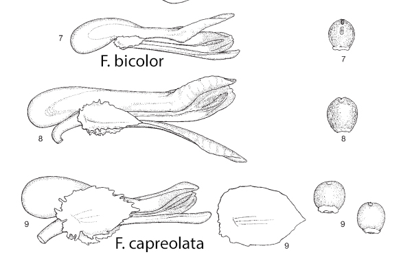 | Андрей Ковальчук | Ещё у F. capreolata плодоножки отогнуты книзу, а у F. bicolor - направлены косо вверх. Такое впечатление, что по этой ссылке смесь двух видов, и у растений с ярким венчиком цветоножки уже отгиба.тся книзу: