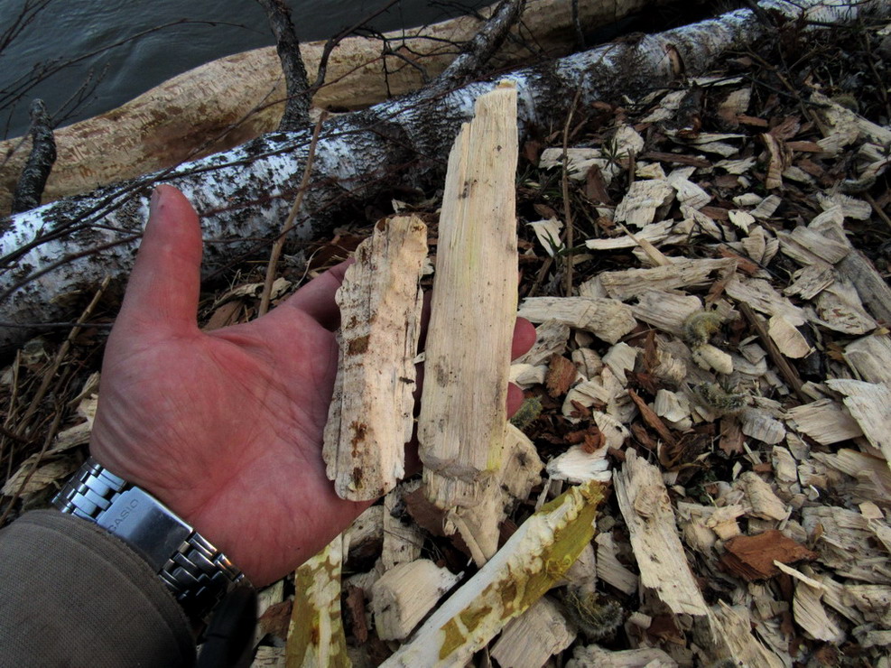 Фрагмент ствола, сточенный бобром. Красноярский край, Ермаковский р-н, окр. пос. Танзыбей, урочище Второе Кольцо, черневой лес. 19.04.2020.