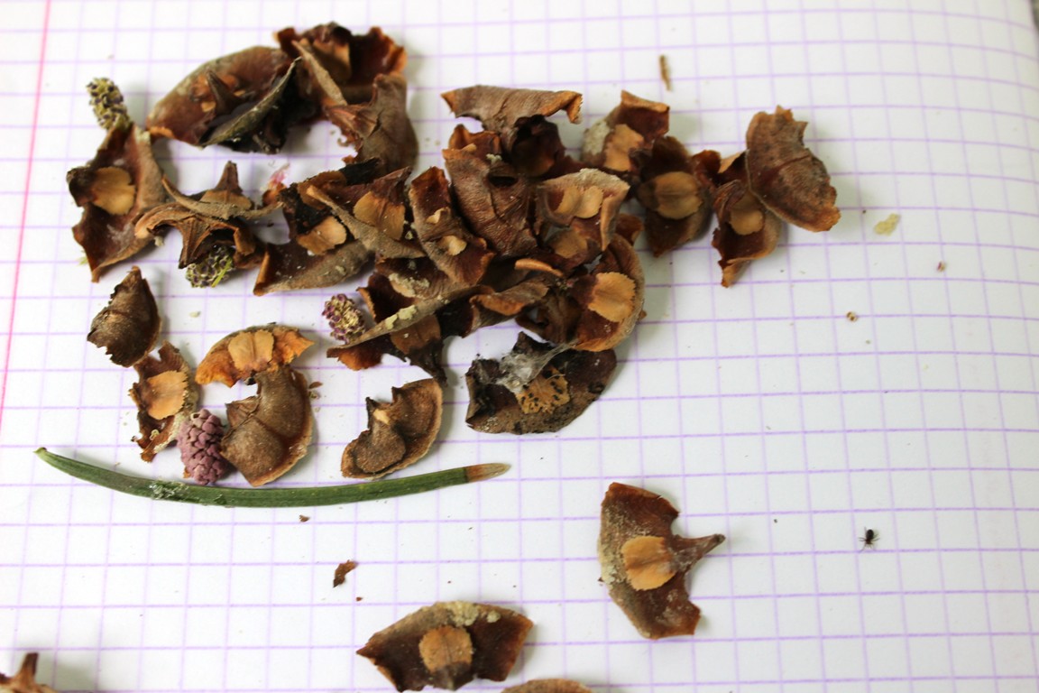 | Анастасия Карелина | Ствол посмотреть и чешуи от шишек под деревом. |