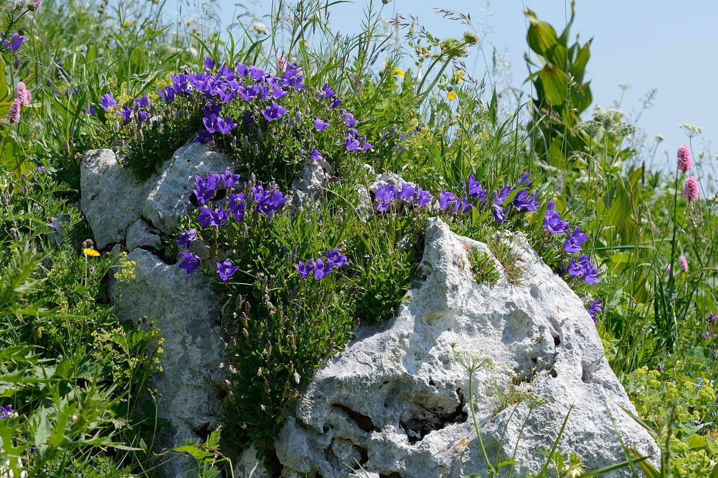 Цветущие растения на скале. Адыгея, Кавказский биосферный заповедник, плато Лаго-Наки, 2040 м н.у.м. 04.07.2020.