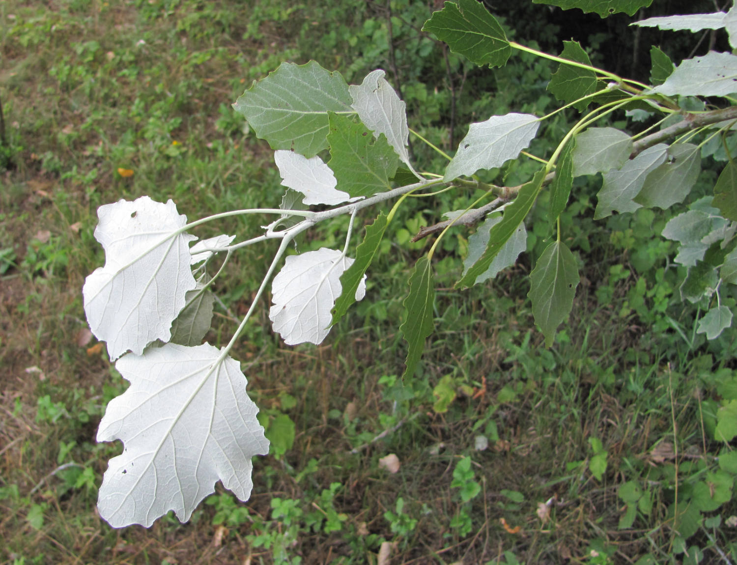| Геннадий Окатов | Сложно сказать.. Там большинство тополей такие. Опушение и форма листа и даже черешков в пределах одной ветви могут сильно варьировать (фото прикрепляю). Думал, это в рамках изменчивости P. alba.. IMG_3227+.JPG |