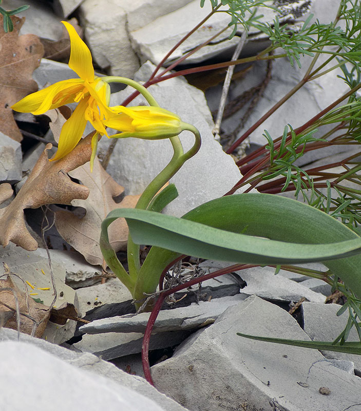 Аномальное цветущее растение. Краснодарский край, окр. г. Новороссийск, Маркотхский хр., гора Большой Маркотх, средняя (ближе к верхней) часть юго-западного склона (трансэлювиальный ландшафт), осыпь с большим (до 70%) объёмом грубообломочного материала (позднемеловые мергель и известняк), подстилаемая верхнемеловыми карбонатными отложениями. 24.04.2021.