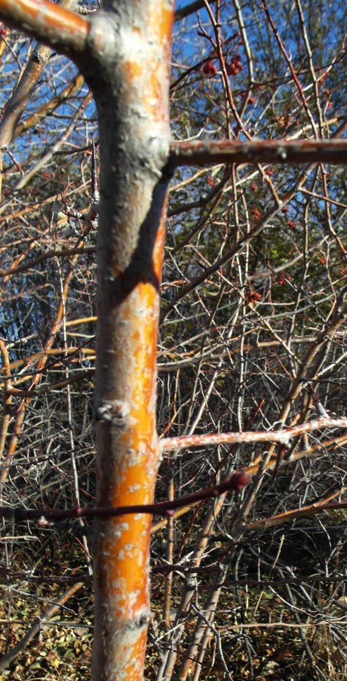 Плоды оранжево-красные и красные 8-10мм после заморозков. Количество косточек в кисти колеблется от 3 до 5, но в случае 3 и 4 косточек, одна чаще всего толще, возможно, срастание по 2 (не разделяется). Старое дерево с фото цветов шипов не имеет; вообще, все старые деоревья без шипов. Под одним из них нашел один аномальный побег с 4 шипами 14-20мм длиной (набор косточек также от 3 до 5). Кора красновато-коричневая оранжевая со светло-серыми пятнами переходит в коричневую серовато-коричневую старую и серую шелушащуюся. Из семян выросло второе поколение в виде густой живой изгороди (несколько тысяч угнетенных побегов и все без шипов). Косточки желтые по 4-5штук, но мельче, чем у мощных деревьев.Посмотрите, какого цвета плоды, а также важен их размер, цвет коры вегетативных побегов и коры взрослого дерева, шипы, листья с двух сторон. |