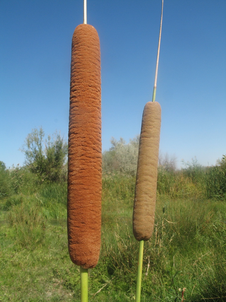 Верхушка плодоносящего растения в сообществе с Typha angustifolia (соплодия справа и слева на заднем плане). Южный Казахстан, Жамбылская обл., пойма р. Асса. 3 сентября 2021 г.