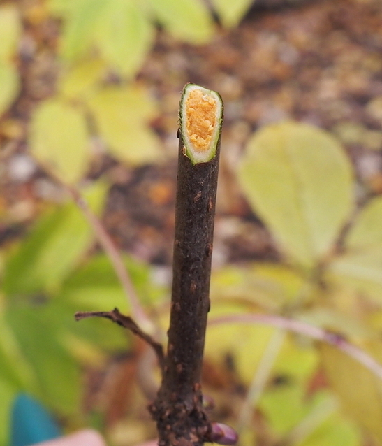 С плодами теперь уже только на следующий год, все опали. Фото листьев прикладываю. Также, судя по определителю, единственно доступный однозначный признак сейчас - цвет сердцевины, так что сделала срез, фото также прикладываю.