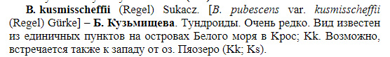 | Виктор Кишиневский | Может это Betula × kusmisscheffii - гибрид Betula pubescens Ehrh. × Betula czerepanovii N.I.Orlova? Судя по карте распространения вполне возможно. Хотя по северным березам много различных мнений. Вот и определяй эти берёзы. Советую почитать Береза: вопросы изменчивости (морфо-физиологические и биохимические аспекты) / Л.B. Ветчинникова; |