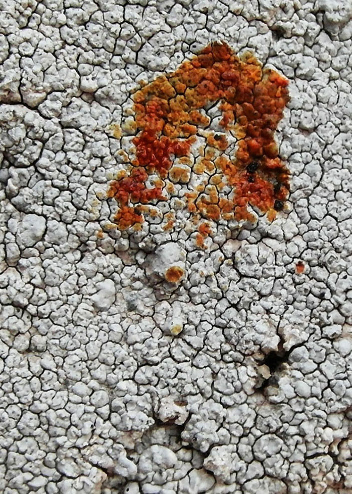 Часть таллома с каймой подслоевища на гранитном субстрате. Казахстан, Карагандинская обл., Каркаралинский национальный парк, южный склон каменистого плато с сосновым лесом, нижняя часть, расщелина в тени скал. 08.04.2021.
